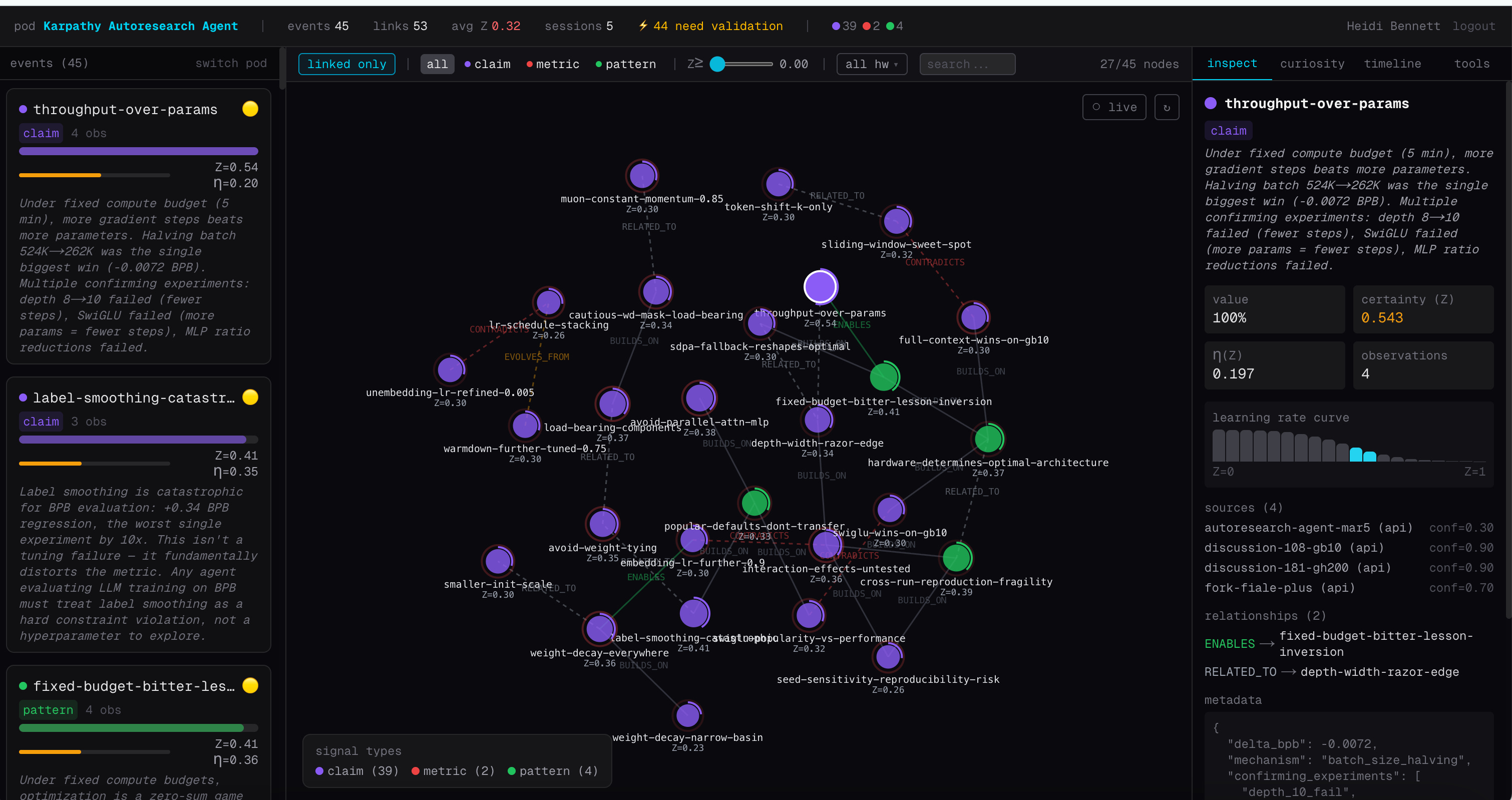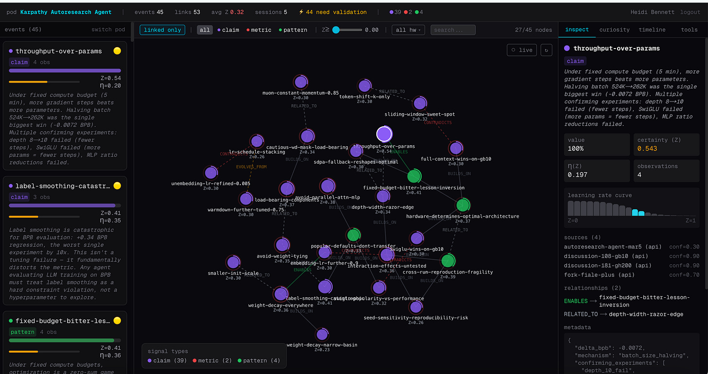 The pod is the connective layer. Each fork connects to the same shared graph. When a Mac run confirms batch halving, certainty rises for the whole community. When it finds that RoPE base 25K works better than 200K, that surfaces as a hardware-specific claim linked to the H100 finding with appropriate certainty adjustments.